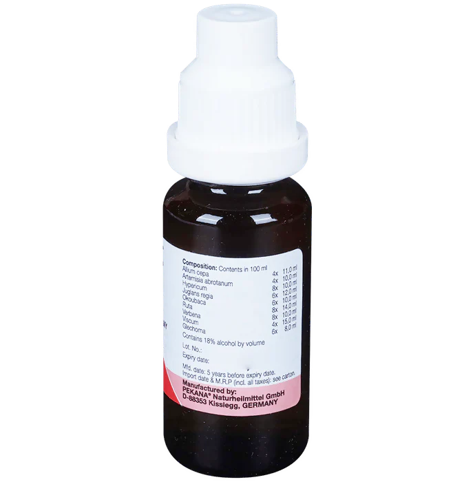 - Allium cepa 4x,Artemisia abrotanum 4x,Hypericum 8x,Juglans regia 6x,Okoubaka 6x,Ruta 8x,Verbena 8x,Viscum 4x,Glechoma 6x