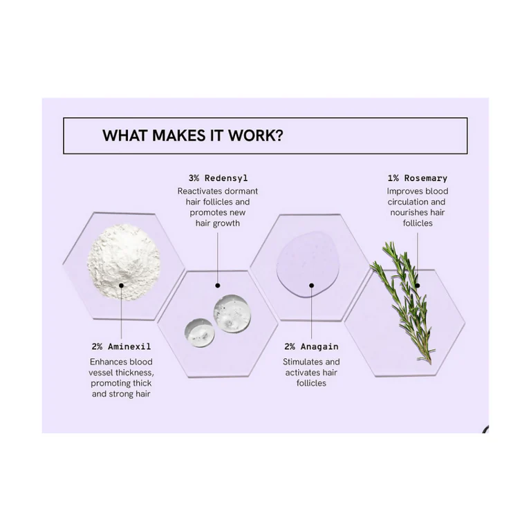 Powered by a blend of Procapil, Redensyl, Biotin, and essential nutrients, the serum works in multiple stages to optimize your hair growth cycle. Redensyl helps stimulate follicle stem cells, promoting the formation of new, healthier strands. Procapil strengthens existing hair, improves blood circulation at the roots, and reduces breakage due to everyday stress or environmental damage. Together, these ingredients enhance follicle activity and help reduce hair fall, making your hair appear denser and more voluminous over time.